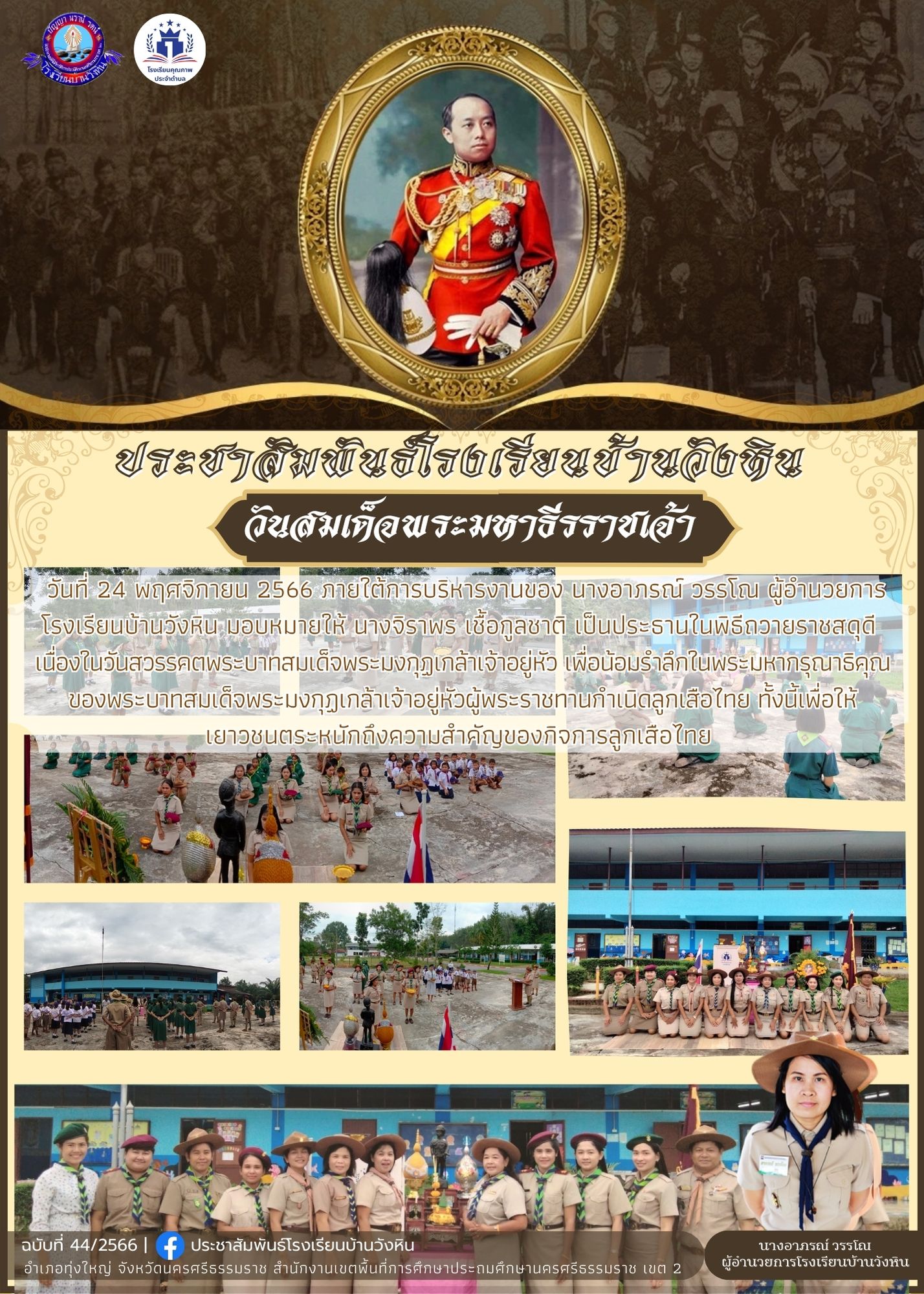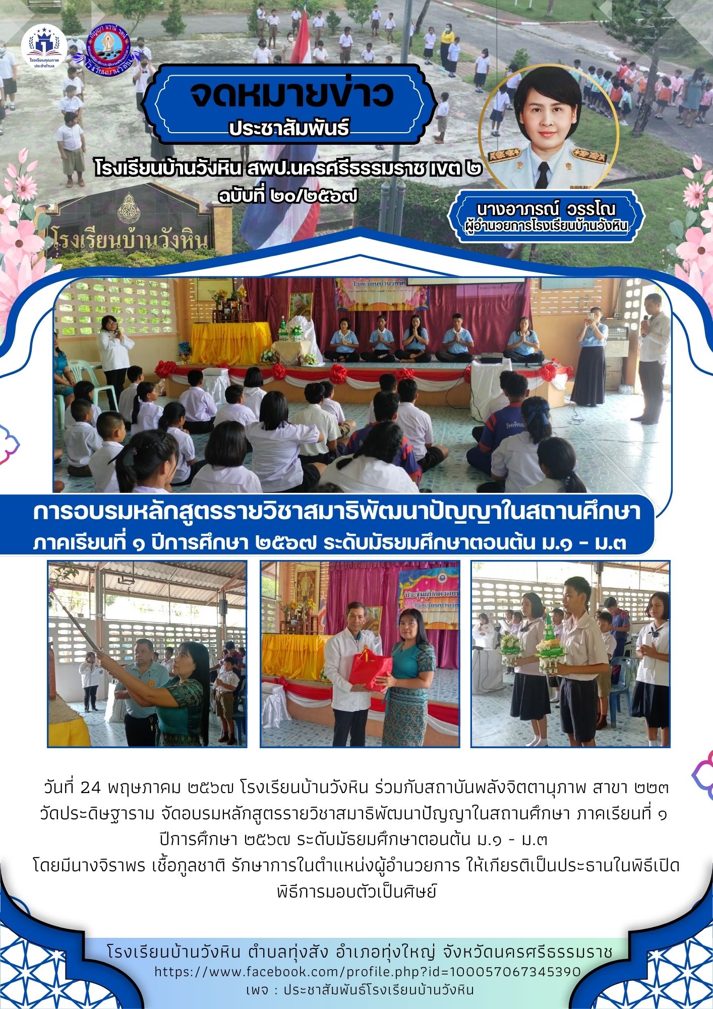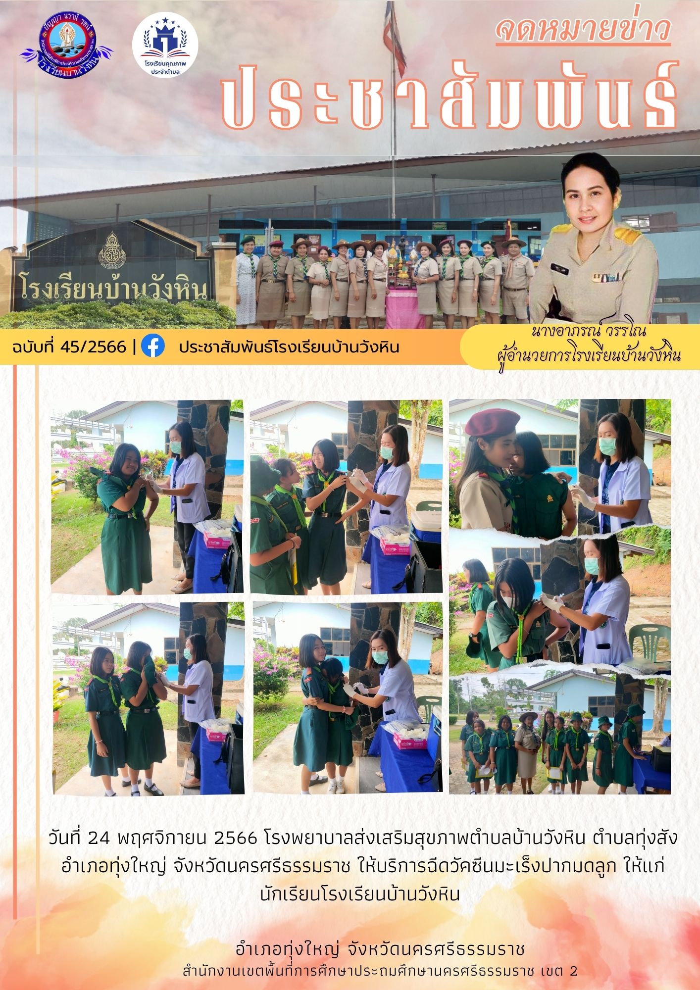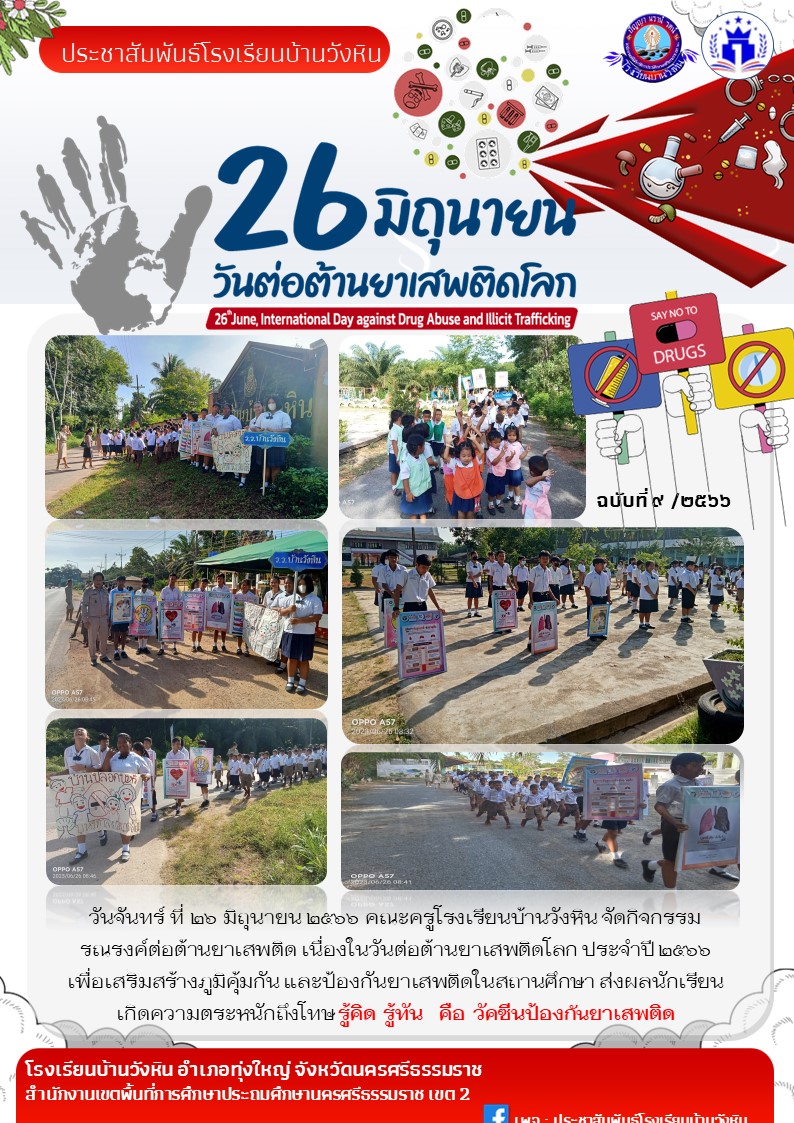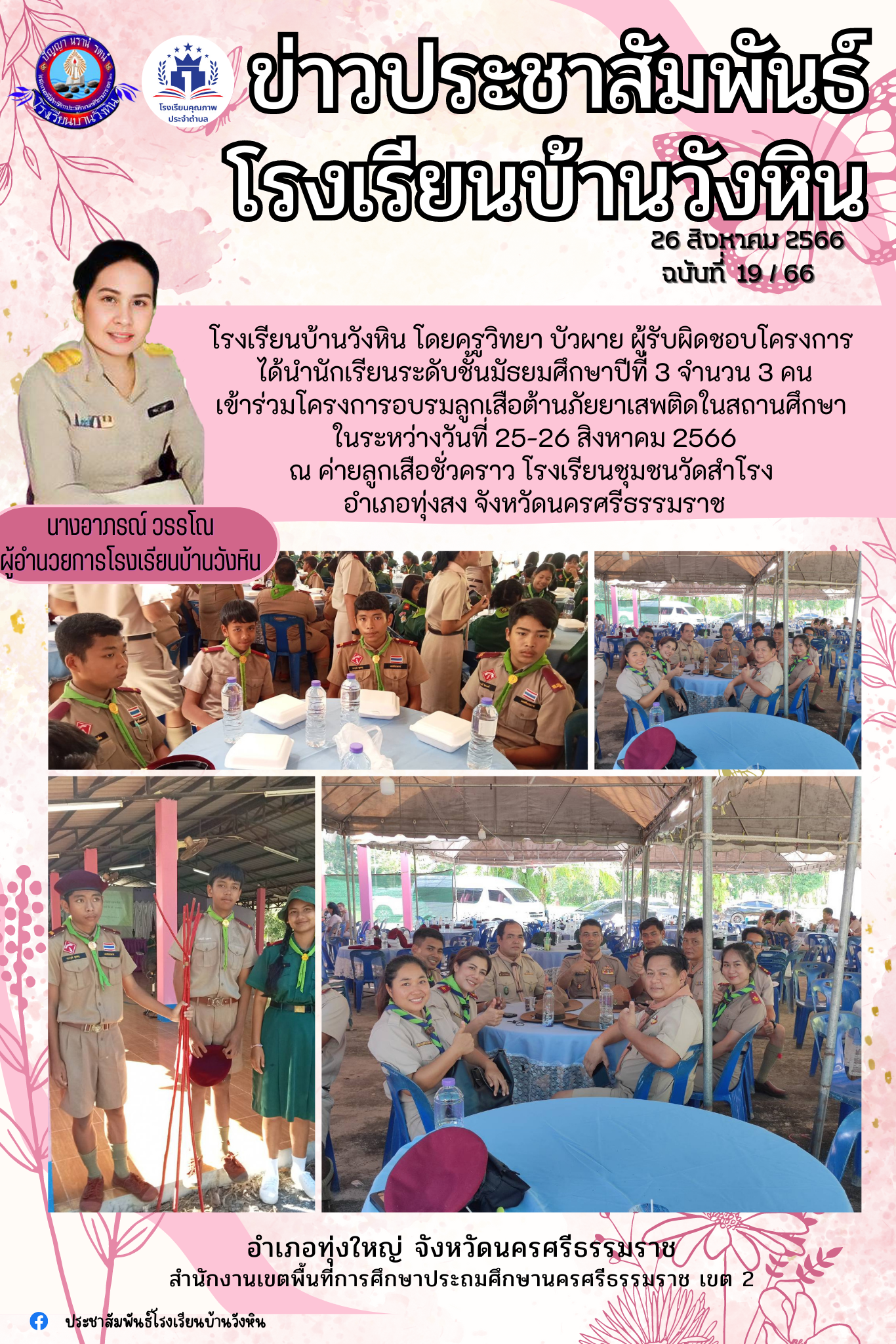 โรงเรียนบ้านวังหิน โดยครูวิทยา บัวผาย ผู้รับผิดชอบโครงการ ได้นำนักเรียนระดับชั้นมัธยมศึกษาปีที่ 3 จำนวน 3 คน เข้าร่วมโครงการอบรมลูกเสือต้านภัยยาเสพติดในสถานศึกษา ในระหว่างวันที่ 25-26 สิงหาคม 2566 ณ ค่ายลูกเสือชั่วคราว โรงเรียนชุมชนวัดสำโรง อำเภอทุ่งสง จังหวัดนครศรีธรรมราช