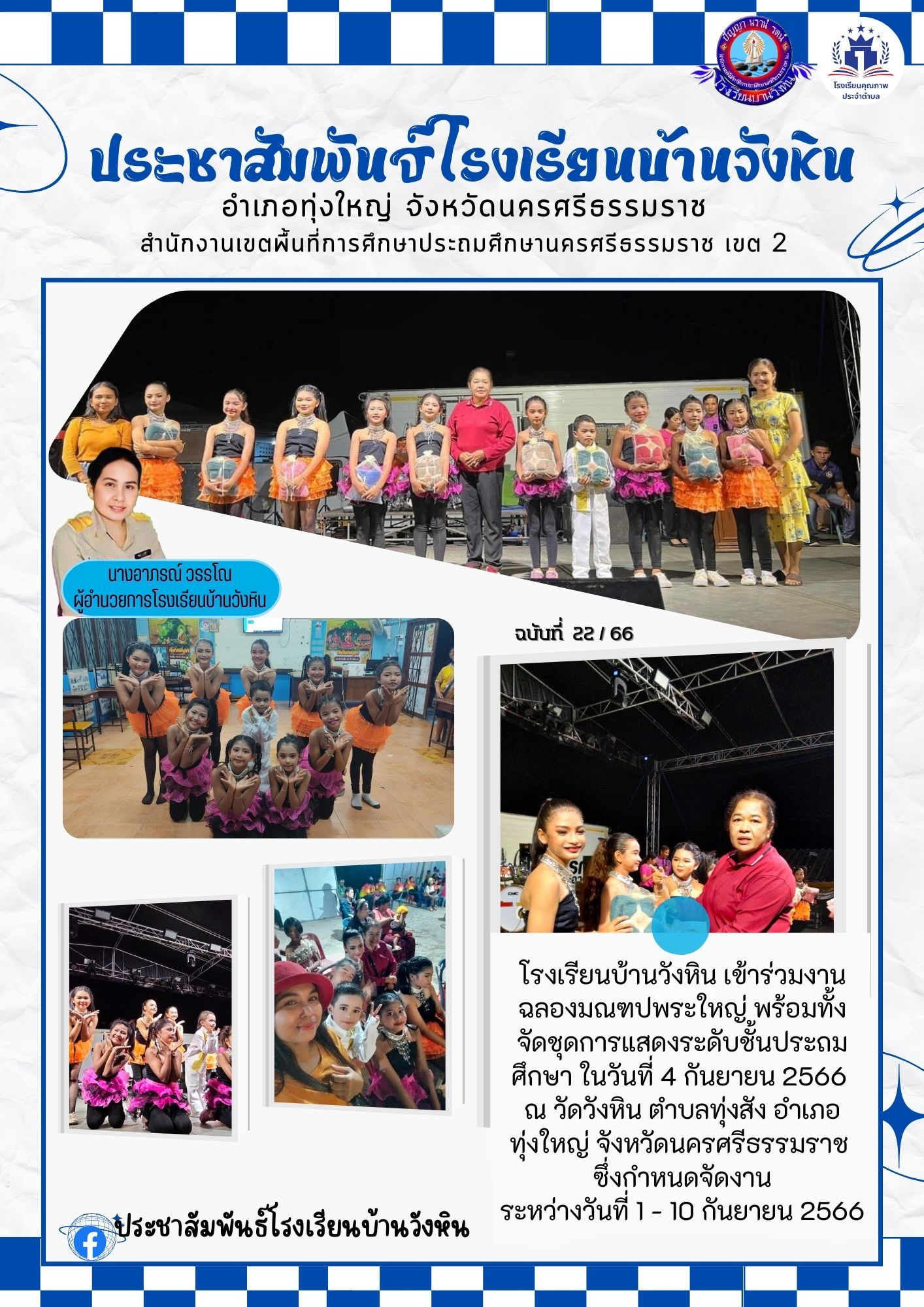 โรงเรียนบ้านวังหิน เข้าร่วมงานฉลองมณฑปพระใหญ่ พร้อมทั้ง จัดชุดการแสดงระดับชั้นประถมศึกษา ในวันที่ 4 กันยายน 2566 ณ วัดวังหิน ตำบลทุ่งสัง อำเภอทุ่งใหญ่ จังหวัดนครศรีธรรมราช ซึ่งกำหนดจัดงาน ระหว่างวันที่ 1 - 10 กันยายน 2566