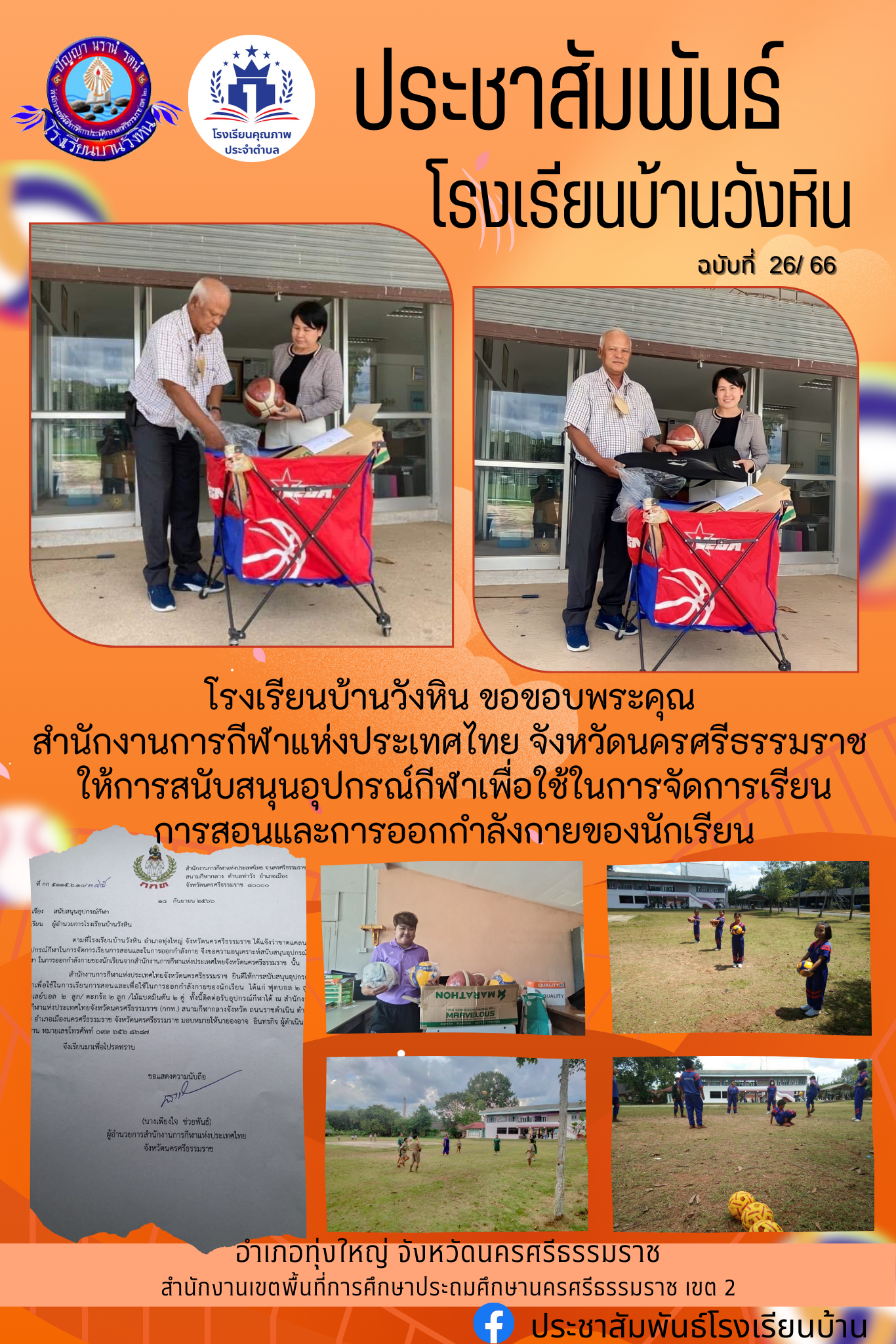 โรงเรียนบ้านวังหิน ขอขอบพระคุณ #สำนักงานการกีฬาแห่งประเทศไทย จังหวัดนครศรีธรรมราช ให้การสนับสนุนอุปกรณ์กีฬา เพื่อใช้ในการจัดการเรียนการสอนของนักเรียนและการออกกำลังกายของนักเรียน โรงเรียนบ้านวังหิน