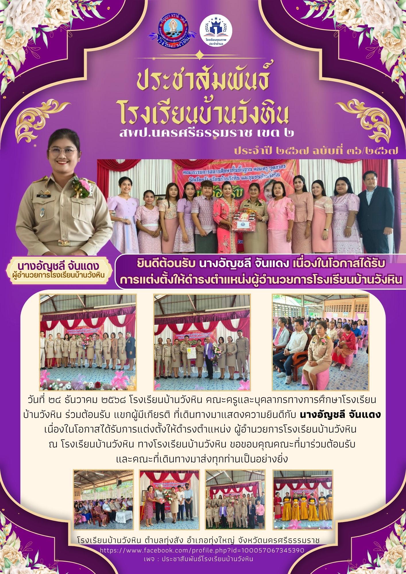 ยินดีต้อนรับ นางอัญชลี จันแดง เนื่องในโอกาสได้รับ การแต่งตั้งให้ดำรงตำแหน่งผู้อำนวยการโรงเรียนบ้านวังหิน